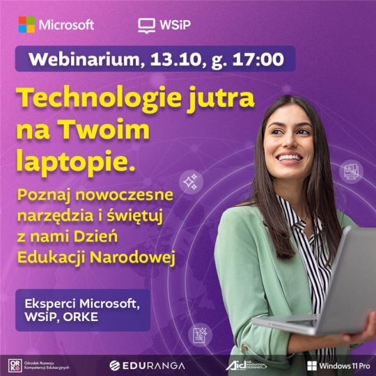 Dołącz do bezpłatnego webinaru dla nauczycieli, dyrektorów szkół podstawowych i ponadpodstawowych, przygotowanego wspólnie przez WSiP, Microsoft i AiD, czyli doświadczonych partnerów od lat wspierających szkoły skutecznymi rozwiązaniami. Poznaj nowoczesne technologie, które wkrótce staną się praktycznym wsparciem w codziennej pracy z uczniami.