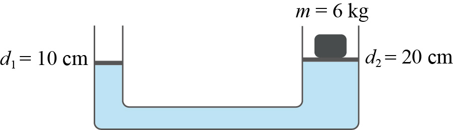 Tłoki podnośnika hydraulicznego mają średnice \(10\,\text{cm}\) i \(20\,\text{cm}\). Na większym tłoku ustawiono ciało o masie \(6\,\text{kg}\).