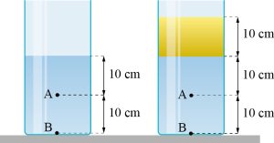 Poziom wody w naczyniu był na wysokości \(20\,\text{cm}\). Do naczynia dolano oleju w taki sposób, że jego słup miał wysokość \(10\,\text{cm}\). Gęstość wody wynosi \(1000\,\frac{\text{kg}}{\text{m}^3}\) ,